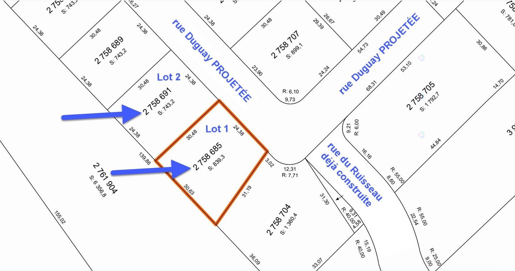 Veuillez noter que ces deux terrains sont actuellement légèrement enclavés. Toutefois, ils sont entourés de rues déjà construites (du Ruisseau, Trudelle, Duguay). D'ailleurs, la rue du Ruisseau est construite et se rend à +/- 7 mètres du premier terrain. L'accès à partir de cet endroit est envisageable.